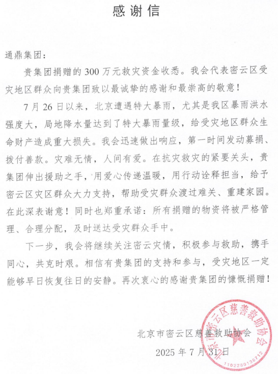 在抗災救災的緊要關頭,通鼎集團積極響應號召,緊急向北京市密云區(qū)捐贈300萬元人民幣。密云區(qū)慈善救助協(xié)會在接收善款后,向通鼎集團發(fā)來感謝信。信中表示:“災難無情,人間有愛。在抗災救災的緊要關頭,貴集團伸出援助之手,用愛心傳遞溫暖,用行動詮釋擔當,給予密云區(qū)災區(qū)群眾大力支持,幫助受災群眾渡過難關、重建家園。”協(xié)會鄭重承諾將嚴格管理、合理分配善款,確保及時送達受災群眾手中。