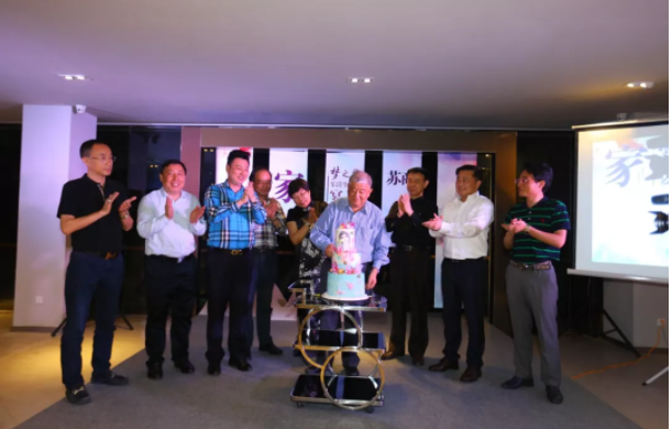 生日趴的重頭戲最后登場。十余位生于五六月份的企業(yè)家齊齊登臺,藍色“戲·夢·緣”生日蛋糕隨后入場,由最年長的壽星——南京金箔控股集團董事局主席江寶全切開蛋糕。
