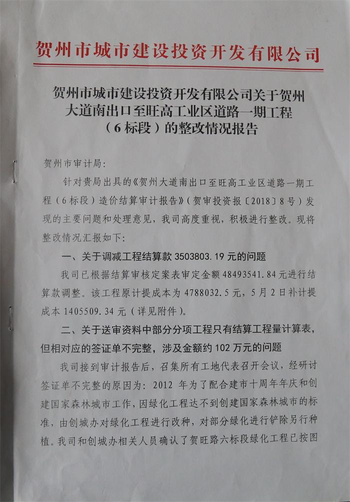 附件一:關(guān)于賀州市文化中心、文化廣場建設(shè)項目2017年跟蹤審計整改情況的報告 pdf